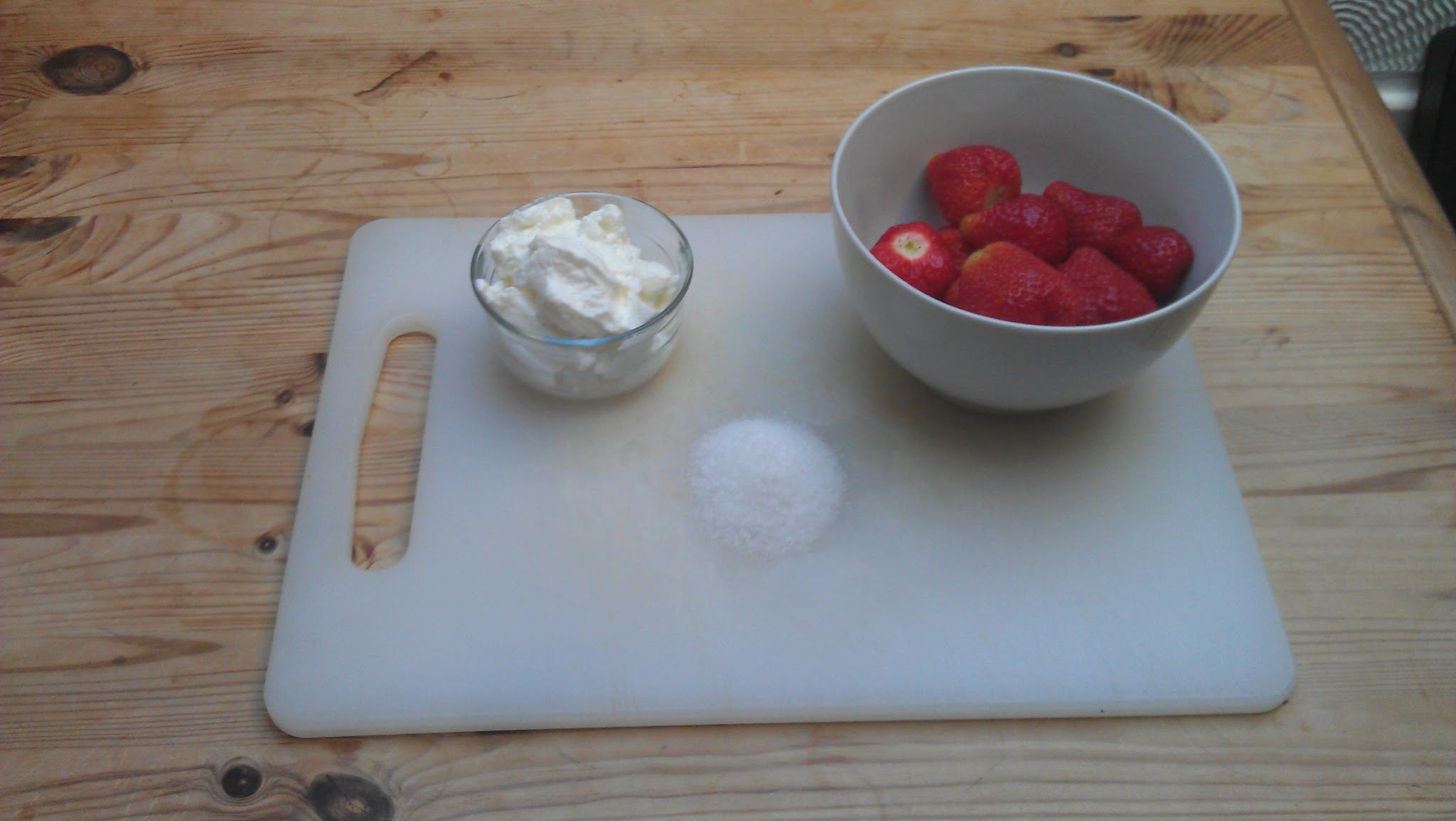 So here is my healthy alternative to go ahead!™ if you just take half the sugar and half the yoghurt you have the equivalent of one slice, and if you take all the strawberries, you have the equivalent of the two slices. So pictured right we have two measly go ahead!™ yoghurt breaks strawberry slices and next to them we have one bowl of strawberries, a huge dollop of yoghurt, and more than two teaspoons of sugar. In addition the go ahead!™ bar has all sorts of other crap in it including: