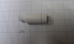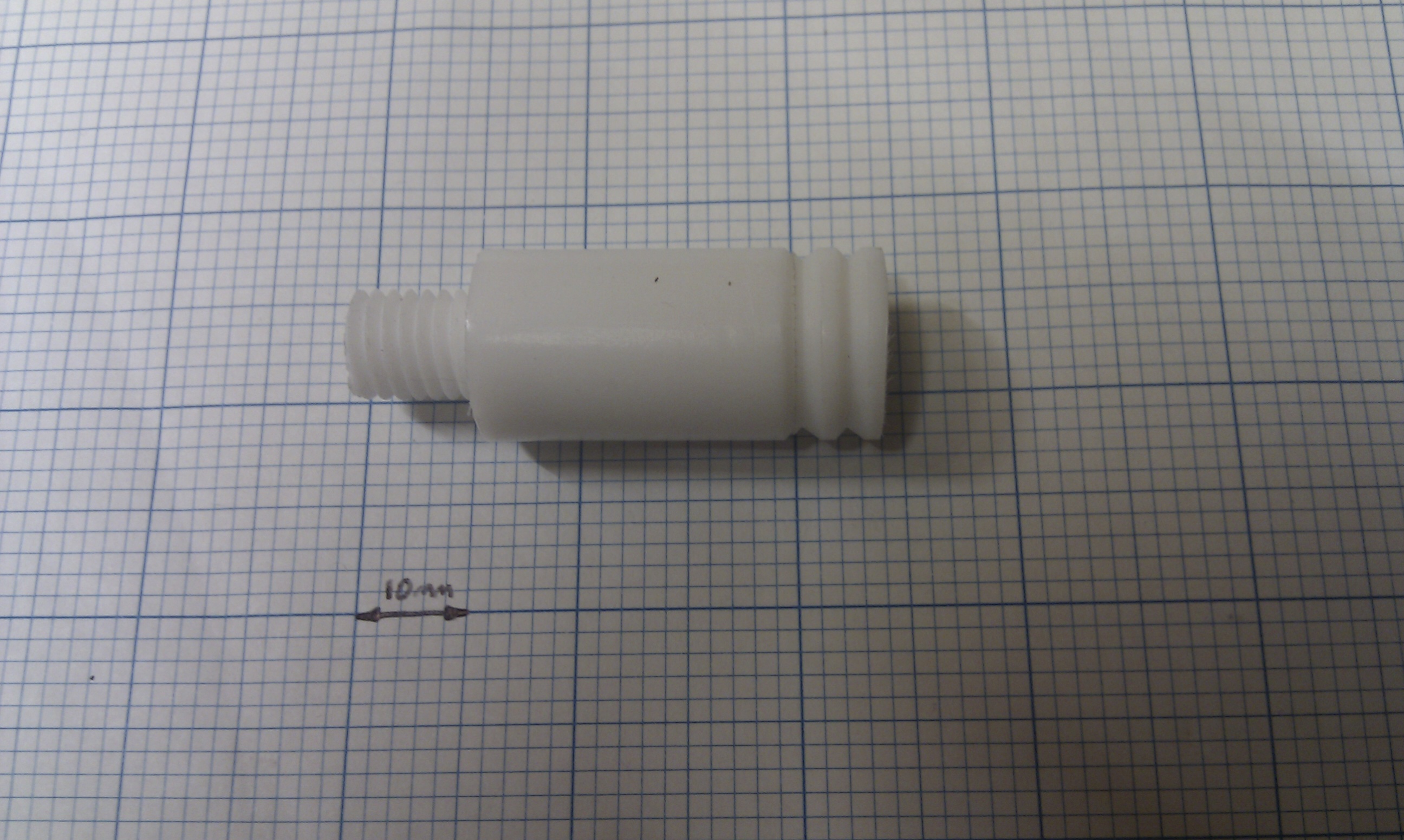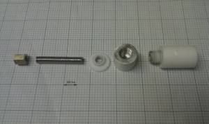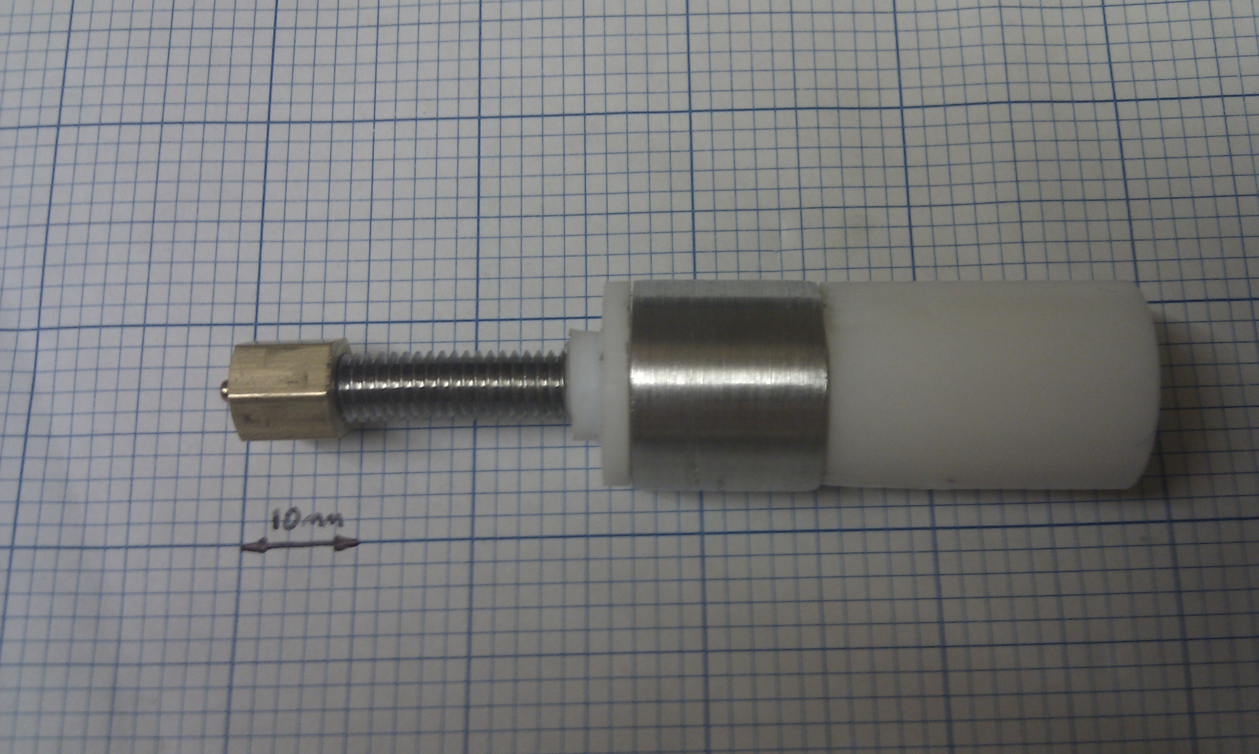 Eventually I came up with something that you are probably all quite familiar with. Its a PEEK insulator with a PTFE insert, however I came up with a slight twist on existing designs. Instead of having an insert that slides into place, my insert is M10 threaded PTFE rod, which screws into an M10 internal thread in 16mm dia PEEK. The brass barrel screws into the PEEK only, and since PEEK is much tougher than PTFE there is little chance of the barrel coming out. The PTFE basically just acts as a nice slippery surface for the filament.